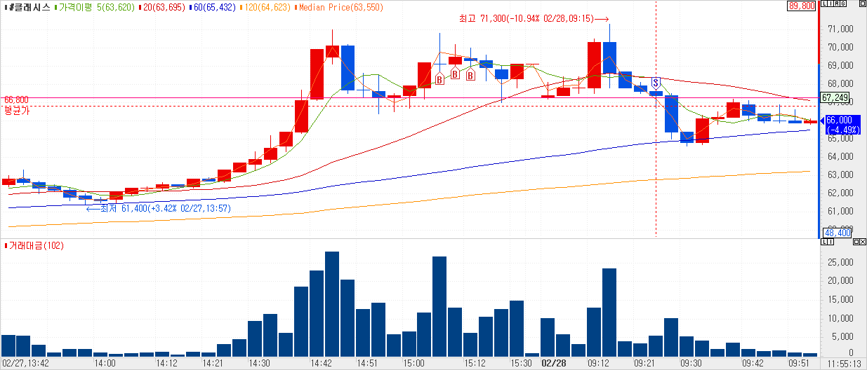 27일 클래시스는 삼성전자의 인수설로주가가 상승하였다. 뉴스로 급등한 종목이고 시가총액과 관련 재료도긍정적이라고 판단하여 오버나잇했다.  9시 12분경 수급이 들어와 상승할 것으로 생각했지만 바로 투매가 나왔다.수익권이었던 계좌는 다시 파란불로 돌아왔고심리적 저항라인과 기계적 손절로 마무리했다. 잘한 점: 확신을 가지고 종가베팅에 참여했다. 부족한 점: 매매당시 주도 테마 대장주가 아니었던 점이 아쉽다. ●총평 최근 손실을 계속 보고있다. 외면하고 쉽지만 포기하고 싶지 않다.나의 그릇을 파악하는 중이라고 생각하고 경험을 쌓고 있는 중이라고 생각한다.