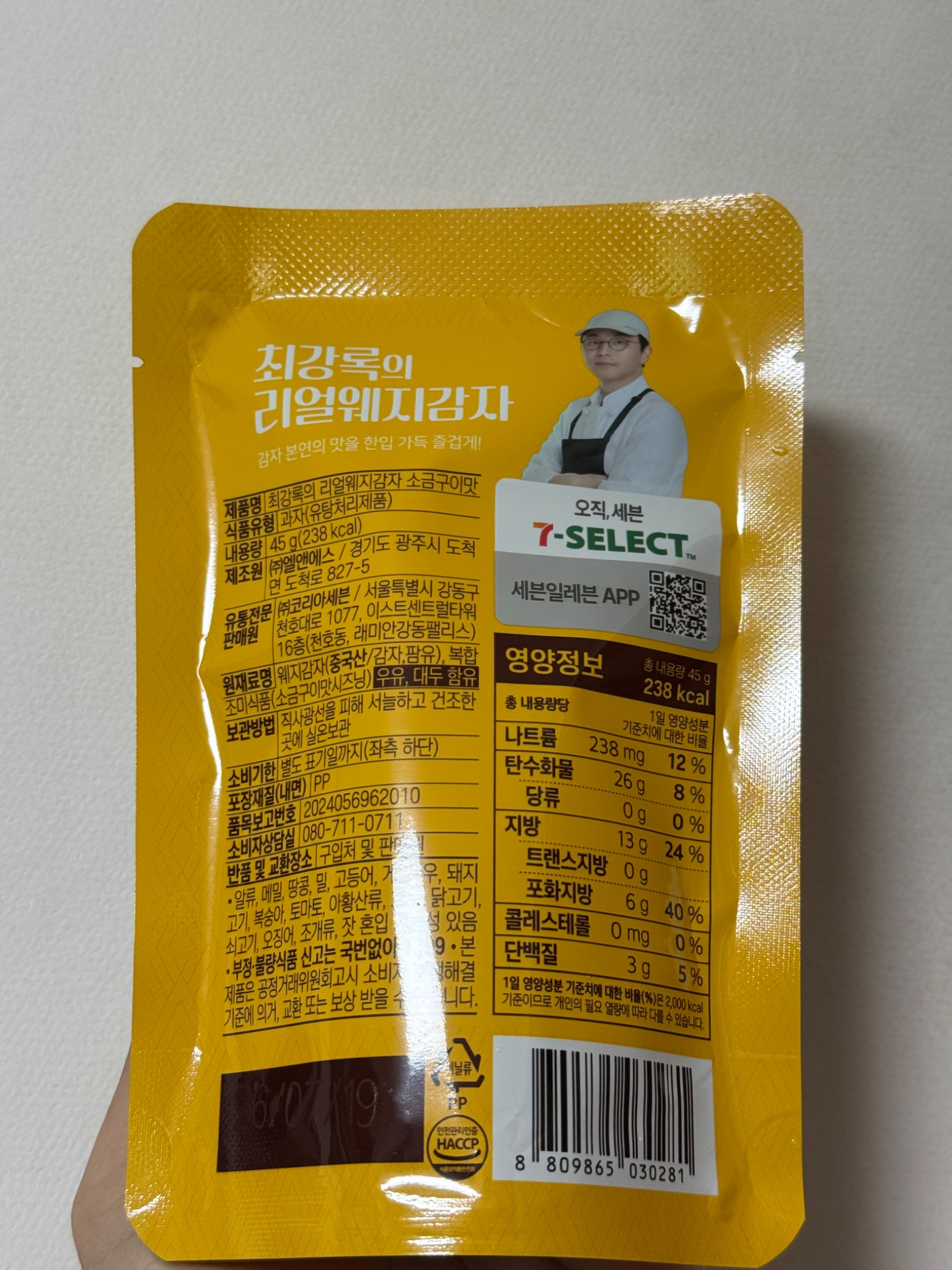 45g 한 봉지에 238kcal, 나트륨 238mg, 지방 13g...